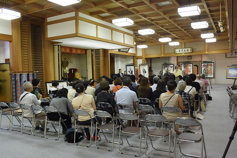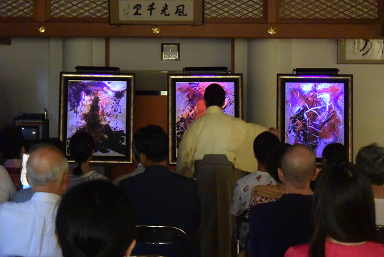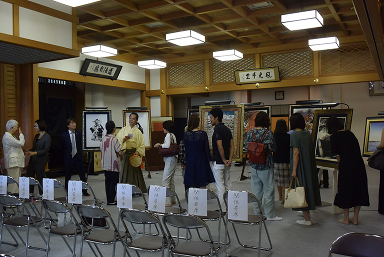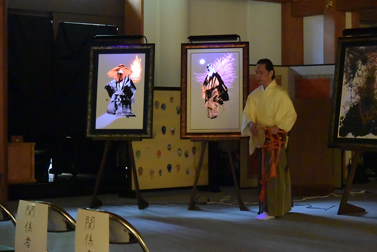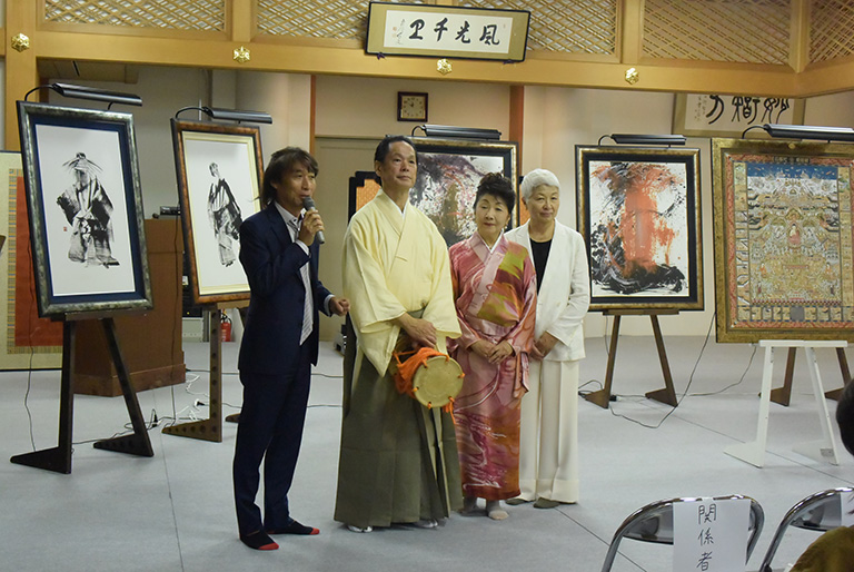 左から(株)アール・グラージュ・インターナショナル 代表取締役社長 仲埜和男氏、大倉正之助氏、左作品「望月」「葵上」を手掛けた書家 末廣博子氏、中央作品「天と地を繋ぐ者」「天と地の柱となる者」「天と地を融合する者」を手掛けた画家 中村土川氏の奥様 思考回路分析家 みさと動心氏。