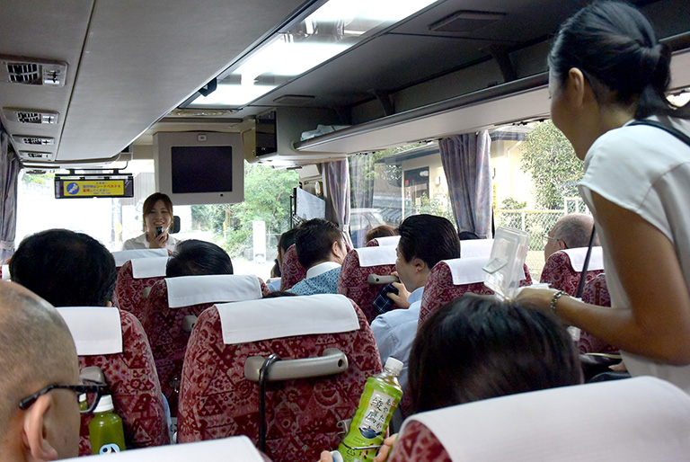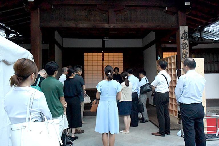 バスに乗って、まずは通常は非公開の「三楽苑」(大原美術館の創設者の私邸)へ。約80年前から、自然を愛し、慈しむ庭づくりが続けられている庭園を、11代 植治 小川治兵衞氏とともに回ったり、邸宅に飾られた棟方志功ほかアーティストの貴重なアートをご覧いただいたり、本当にプレミアムな体験をお楽しみいただきました。