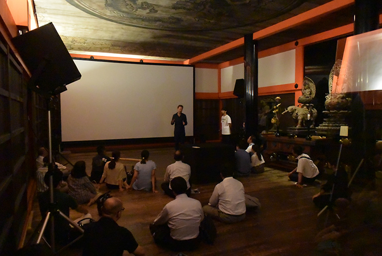 清水寺の閉門後は、いよいよ今回のツアー参加者だけの特別なCONTACT展が開催。一般の方のいない、静かな清水寺での特別な時間が始まります。本展総合ディレクターで小説家の原田マハさんのご案内により、成就院にて展示作品をじっくりと楽しんだ後は、経堂へ移動。ここでは日中は入場できない人も出るほど大人気の、ゲルハルト・リヒターなどの映像作品とマルコ・ブラウ氏のトランペット演奏のコラボレーションを堪能していただきました。