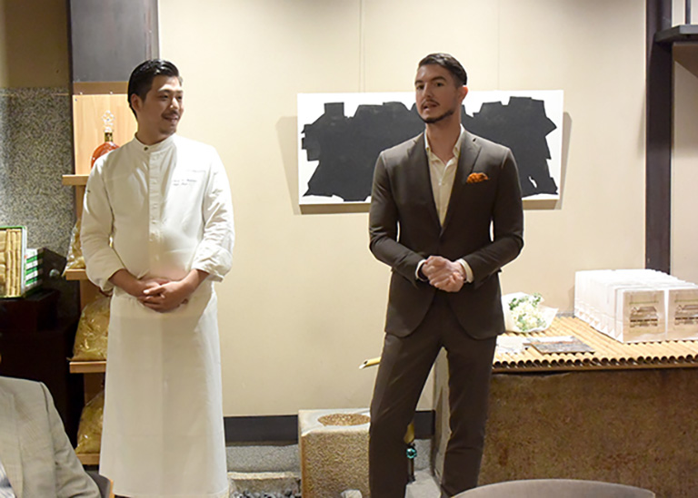 左 carte blanche 料理長 辻裕司氏。右 ルイ13世 プライベートクライアントマネージャー マチュー・タンロンアン氏。お二人のお話でさらに奥深くディナーを楽しむことができたと思います。