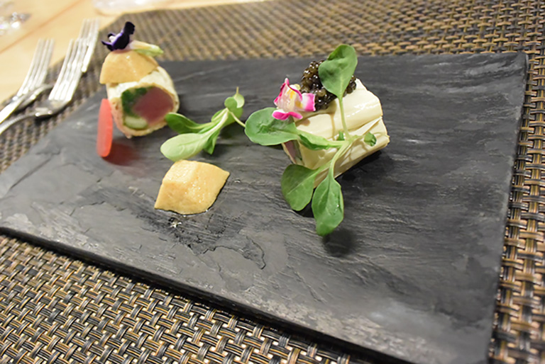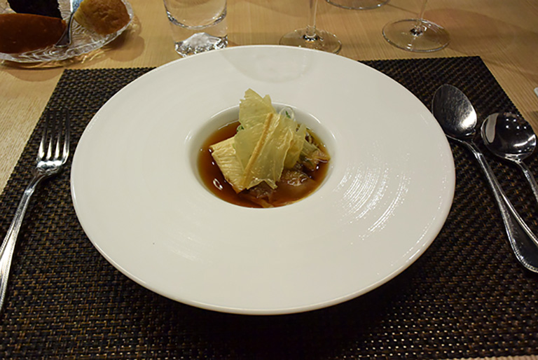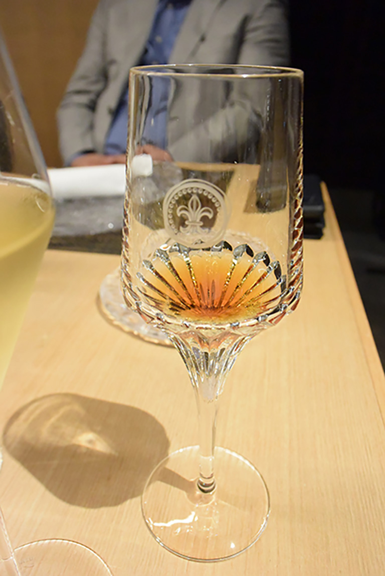 この日のために特別にご用意いただいたルイ13世用のグラス。乾杯をした時の涼やかで華やかな響きに、ご参加いただいた人たちの心も夢見心地に。かぐわしいコニャックの香りと湯葉の風味がマッチ。プレミアム級のお食事を味わう楽しさに心躍らせ、初めて出会う方たちでも会話が弾んでいました。